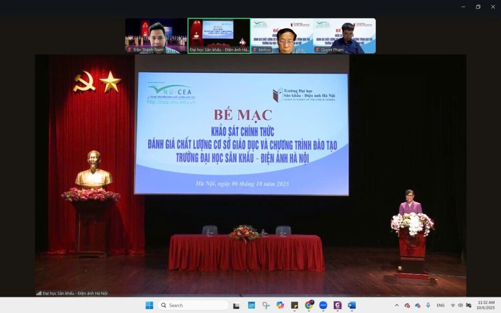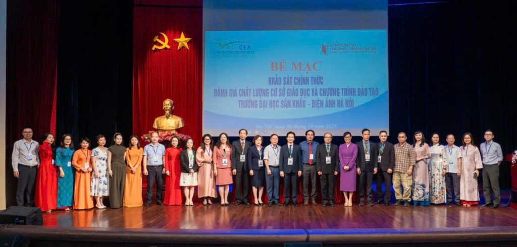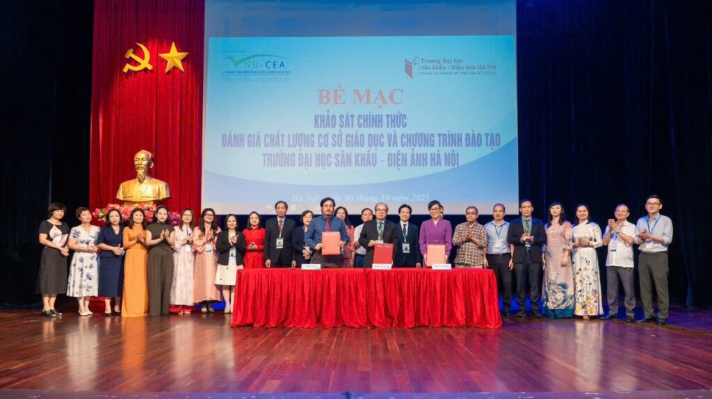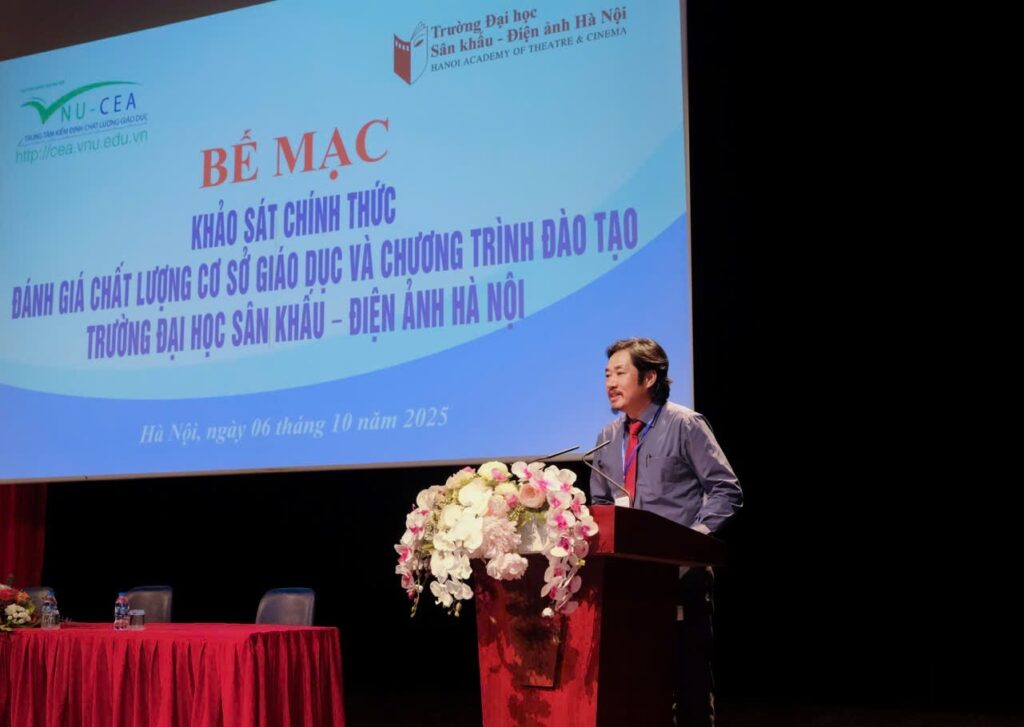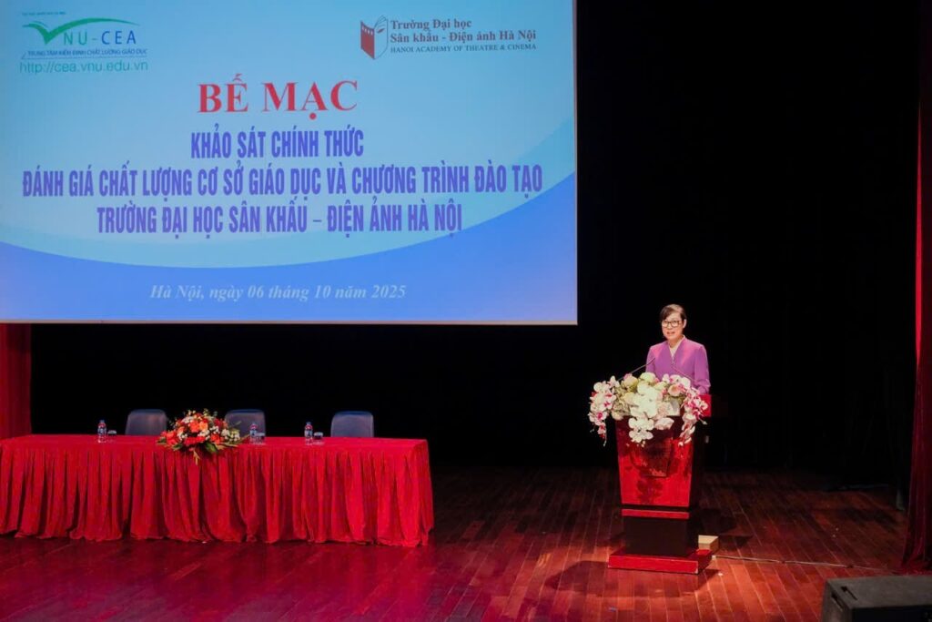 Sau 6 ngày làm việc (từ ngày 01 đến ngày 06/10/2025) khẩn trương, nghiêm túc, trách nhiệm và hiệu quả của Đoàn chuyên gia đánh giá ngoài cùng toàn thể cán bộ, giảng viên, sinh viên và học viên, ngày 06/10/2025, Trường Đại học Sân khấu – Điện ảnh Hà Nội (ĐHSKĐAHN) đã tổ chức Lễ Bế mạc khảo sát chính thức đánh giá ngoài chất lượng cơ sở giáo dục chu kỳ 2 và 03 chương trình đào tạo (CTĐT) bậc đại học gồm: Diễn viên Kịch, Điện ảnh – Truyền hình; Huấn luyện Múa; và Đạo diễn Điện ảnh.