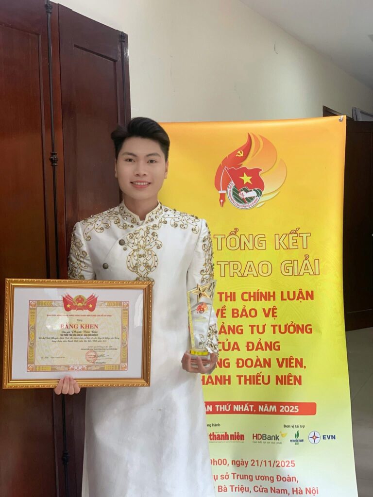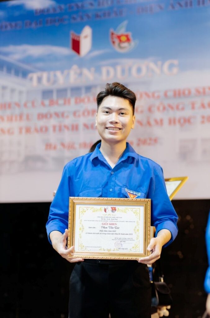 Năm 2025 ghi dấu nhiều thành tích nổi bật của sinh viên Phạm Văn Đức -Ủy viên Ban Chấp hành Đoàn Trường, Bí thư Liên chi đoàn Khoa Kịch hát dân tộc, Trường Đại học Sân khấu – Điện ảnh Hà Nội. Với tinh thần học tập nghiêm túc, bản lĩnh chính trị vững vàng và sự nhiệt huyết trong các hoạt động Đoàn – phong trào thanh niên, Phạm Văn Đức đã liên tiếp đạt được những kết quả đáng ghi nhận, góp phần lan tỏa hình ảnh sinh viên nghệ thuật bản lĩnh, trí tuệ và trách nhiệm với xã hội.