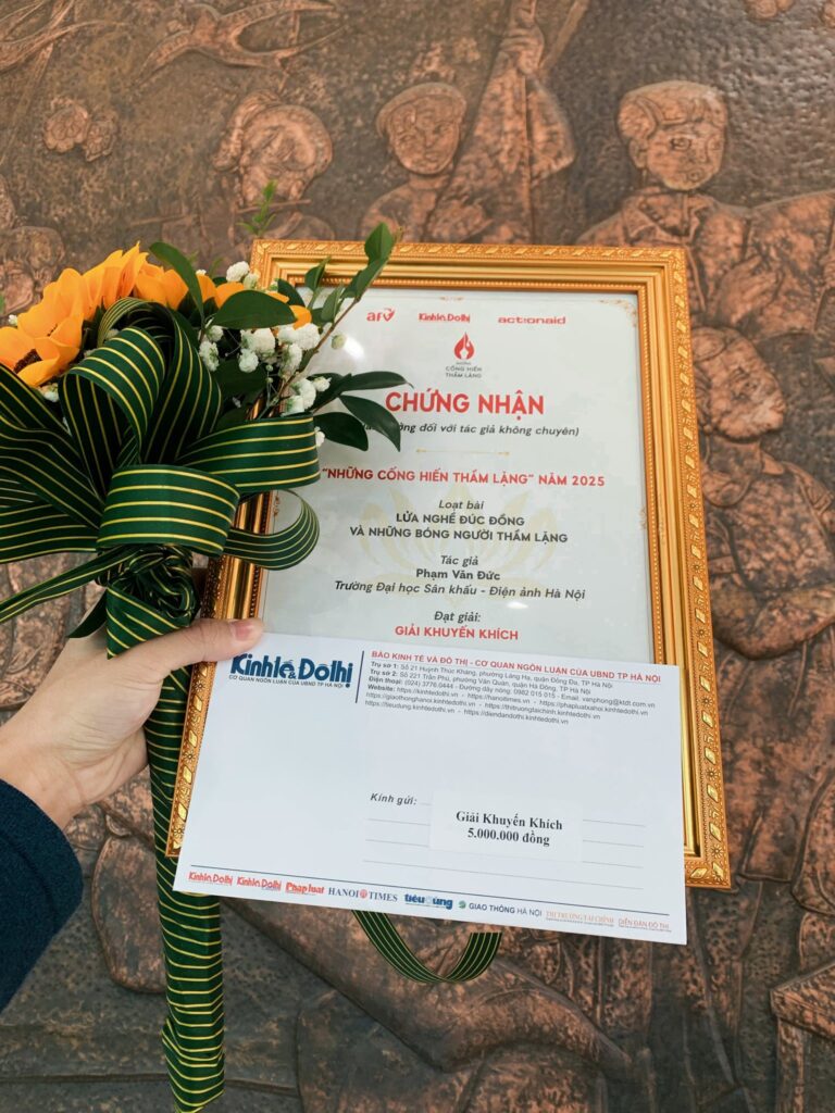 Bên cạnh đó, Phạm Văn Đức tiếp tục đạt giải Khuyến khích Cuộc thi Những cống hiến thầm lặng năm 2025 với loạt bài “Lửa nghề đúc đồng và những bóng người thầm lặng”. Ở giải thưởng này, dấu ấn của sinh viên nghệ thuật được thể hiện rõ nét qua cách tiếp cận đề tài giàu tính nhân văn, khai thác chiều sâu văn hóa – lịch sử và tôn vinh những con người âm thầm gìn giữ giá trị truyền thống. Loạt bài không chỉ phản ánh năng lực viết, quan sát và cảm thụ nghệ thuật của Đức, mà còn cho thấy trách nhiệm của người trẻ trong việc kể lại những câu chuyện đẹp của đời sống lao động, góp phần lan tỏa các giá trị tốt đẹp trong xã hội. Thành tích này một lần nữa khẳng định định hướng đào tạo toàn diện của Trường Đại học Sân khấu – Điện ảnh Hà Nội: đào tạo nghệ sĩ – người làm nghệ thuật gắn liền với đời sống, với con người và với các giá trị văn hóa dân tộc.