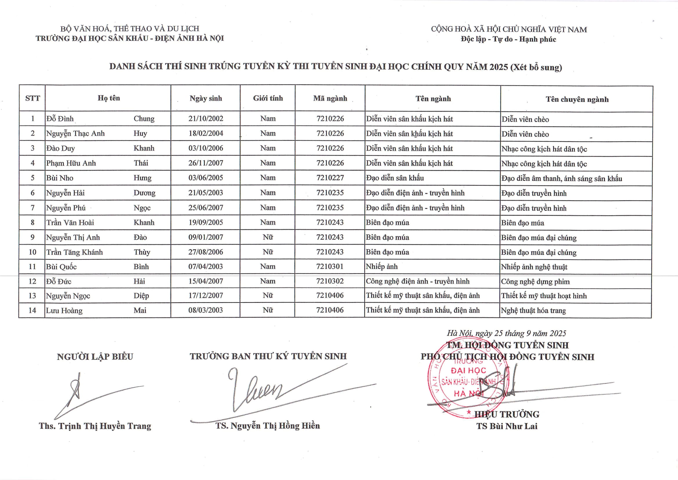 Danh sách trúng tuyển bổ sung kỳ thi tuyển sinh ĐHCQ năm 2025