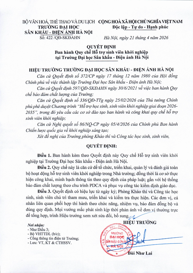 Quyết định số 80/QĐ-SKĐAHN ngày 23/01/2026 về việc ban hành Chiến lược phát triển Trường Đại học Sân khấu – Điện ảnh Hà Nội giai đoạn 2026-2035.