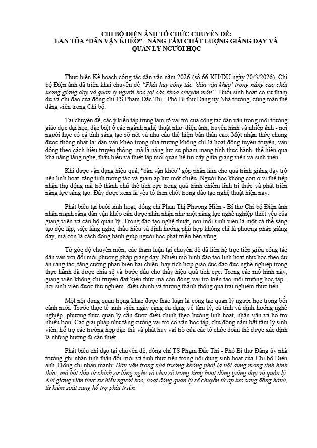 Kế hoạch số 93-KH/ĐU ngày 20/4/2026 về thực hiện Chỉ thị số 09-CT/TU ngày 23/3/2026 của Ban Thường vụ Thành uỷ Hà Nội tại Trường Đại học Sân khấu –…