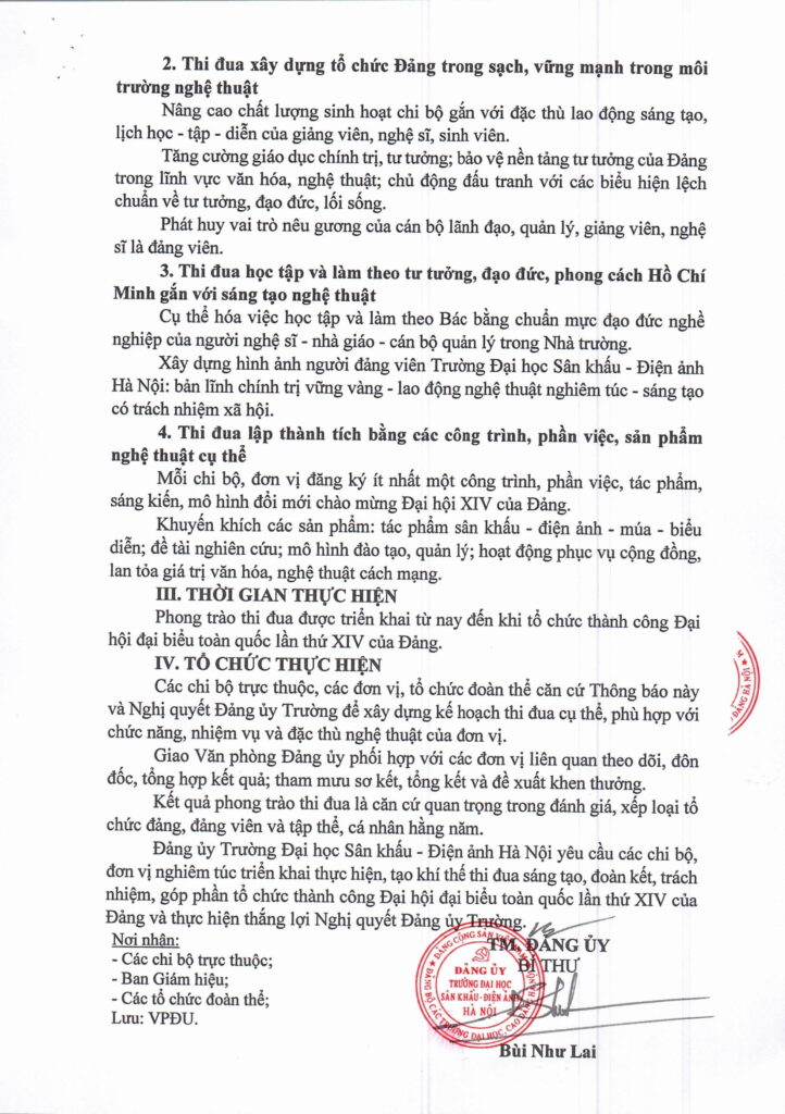 Trang chủ » Thông báo số 34-TB/ĐU ngày 30/12/2025 về việc phát động phong trào thi đua chào mừng Đại hội đại biểu toàn quốc lần thứ XIV của Đảng gắn với thực hiện Nghị quyết Đảng ủy Trường Đại học Sân khấu – Điện ảnh Hà Nội