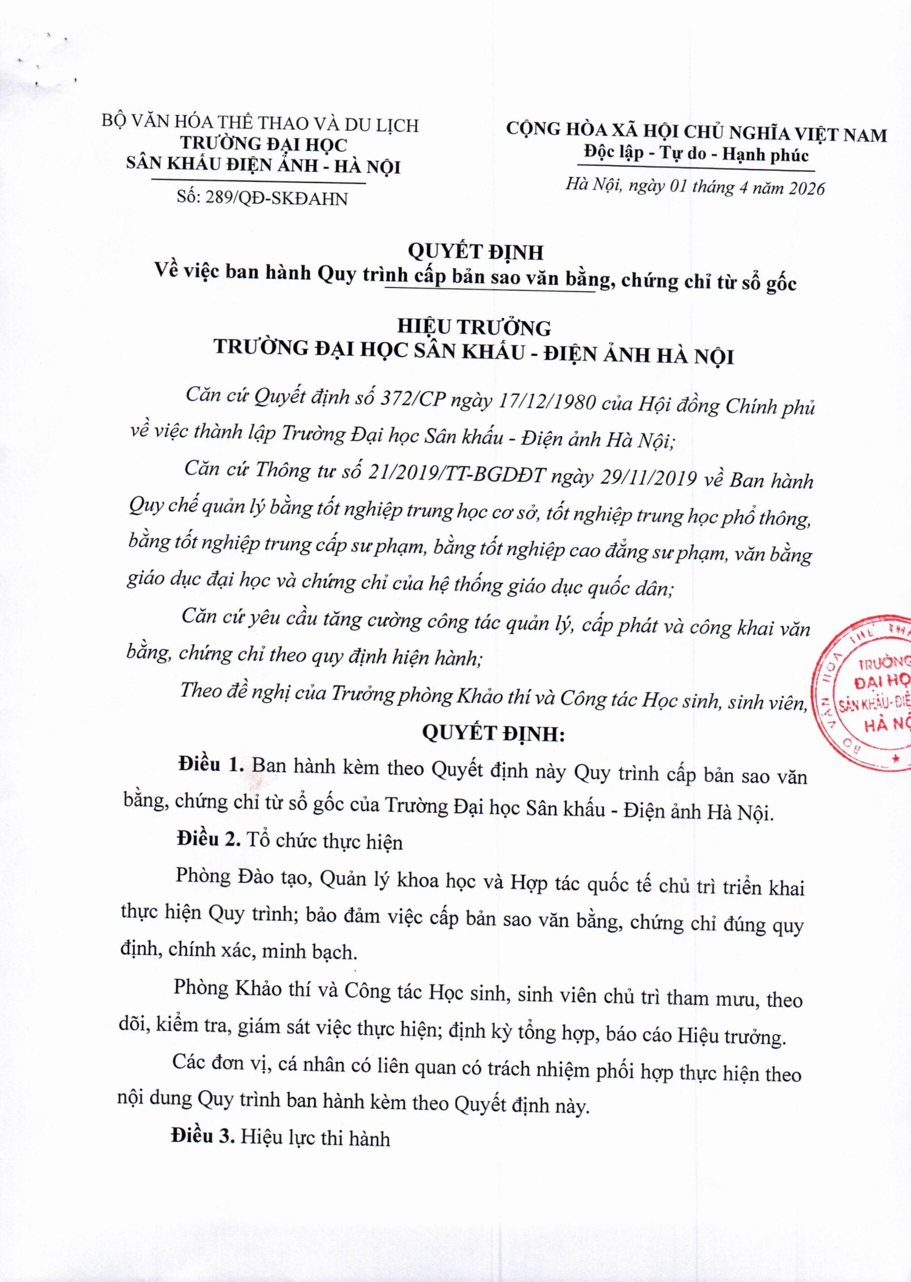 Quyết định ban hành Quy trình cấp bản sao văn bằng, chứng chỉ từ sổ gốc